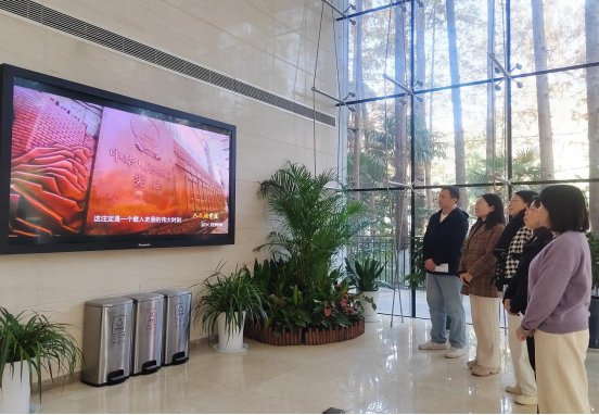 鼓楼区审计局、雨花台区审计局、江宁区审计局组织局全体党员干部开展系列主题活动。活动中专题学习《中华人民共和国宪法》,贯彻落实习近平新时代中国特色社会主义思想;开展百万党员学宪法学党章考法律活动,以考促学,进一步提高审计人员依法审计的意识;组织全体干部职工观看《宪法的精神 法治的力量——2023年度法治人物》节目,推动审计机关工作人员增强宪法意识、依宪依法依规履职。图为开展宪法专题学习现场。