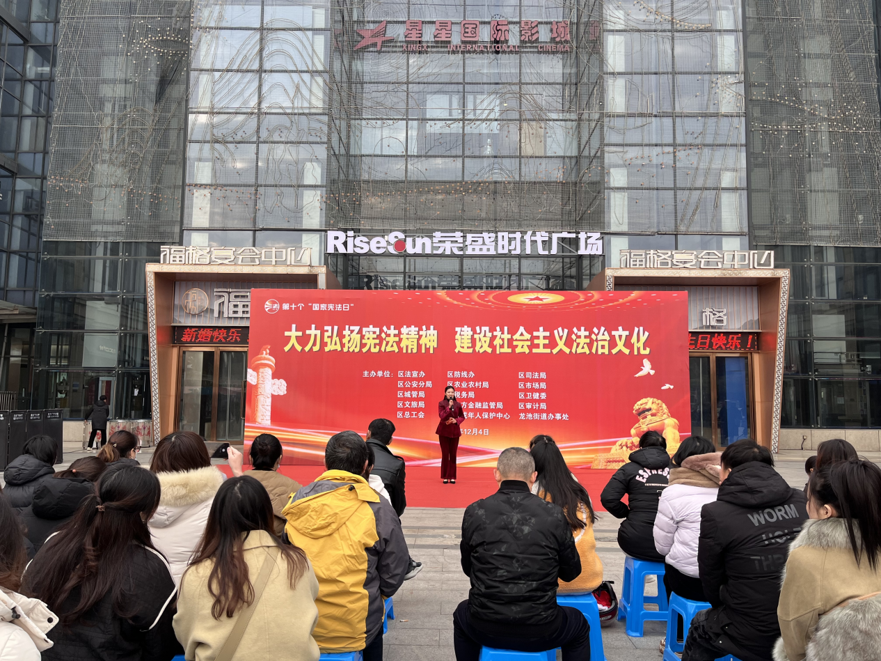 六合区审计局联合区法宣办、区司法局、龙池街道等部门在广场组织宪法宣传活动,通过普法快板、法律知识竞答等群众喜闻乐见的形式开展法律宣传,同时发放宣传手册、提供现场法律咨询,向居民群众讲解审计法和相关政策法规,推动形成学法守法的良好氛围。