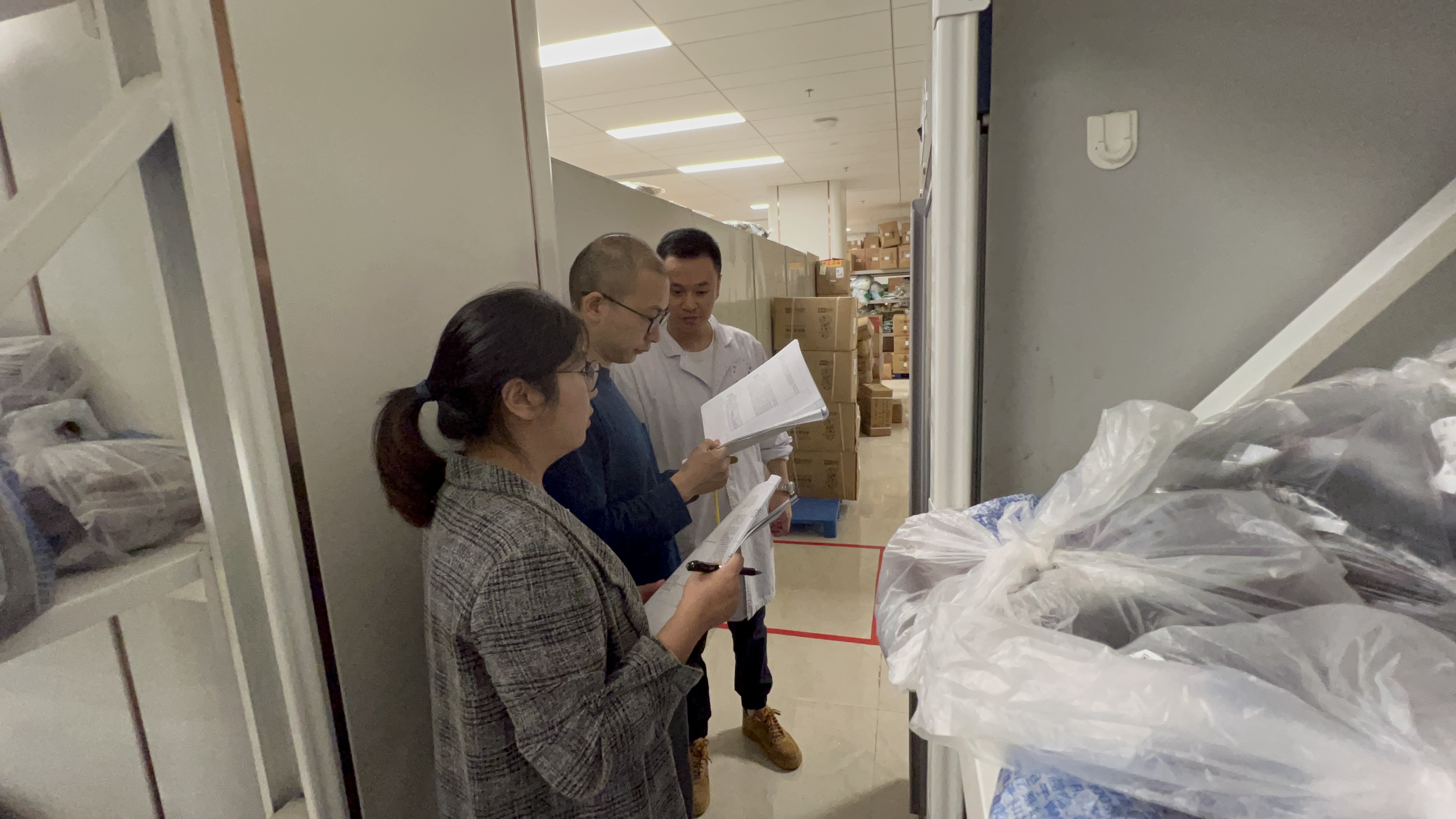 近日,江宁区审计局在开展中医药政策落实情况专项审计调查中,聚焦医用耗材采购、使用管理及销售情况,通过实地盘点、查看HIS进销存记录等方式,审查是否存在高价采购耗材、加价销售等情况,促进医院规范化、精细化管理,助力医疗卫生服务提质增效。图为审计组现场查看医用库存。(王飞、李敏)
