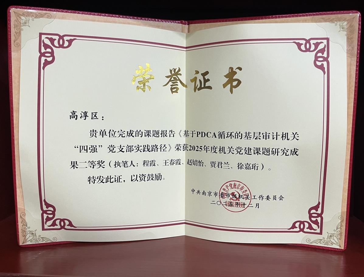 近日,2025年度南京市机关党建课题研究成果评选结果揭晓,高淳区审计局报送的党建课题《基于PDCA循环的基层审计机关“四强”党支部实践路径》荣获二等奖。